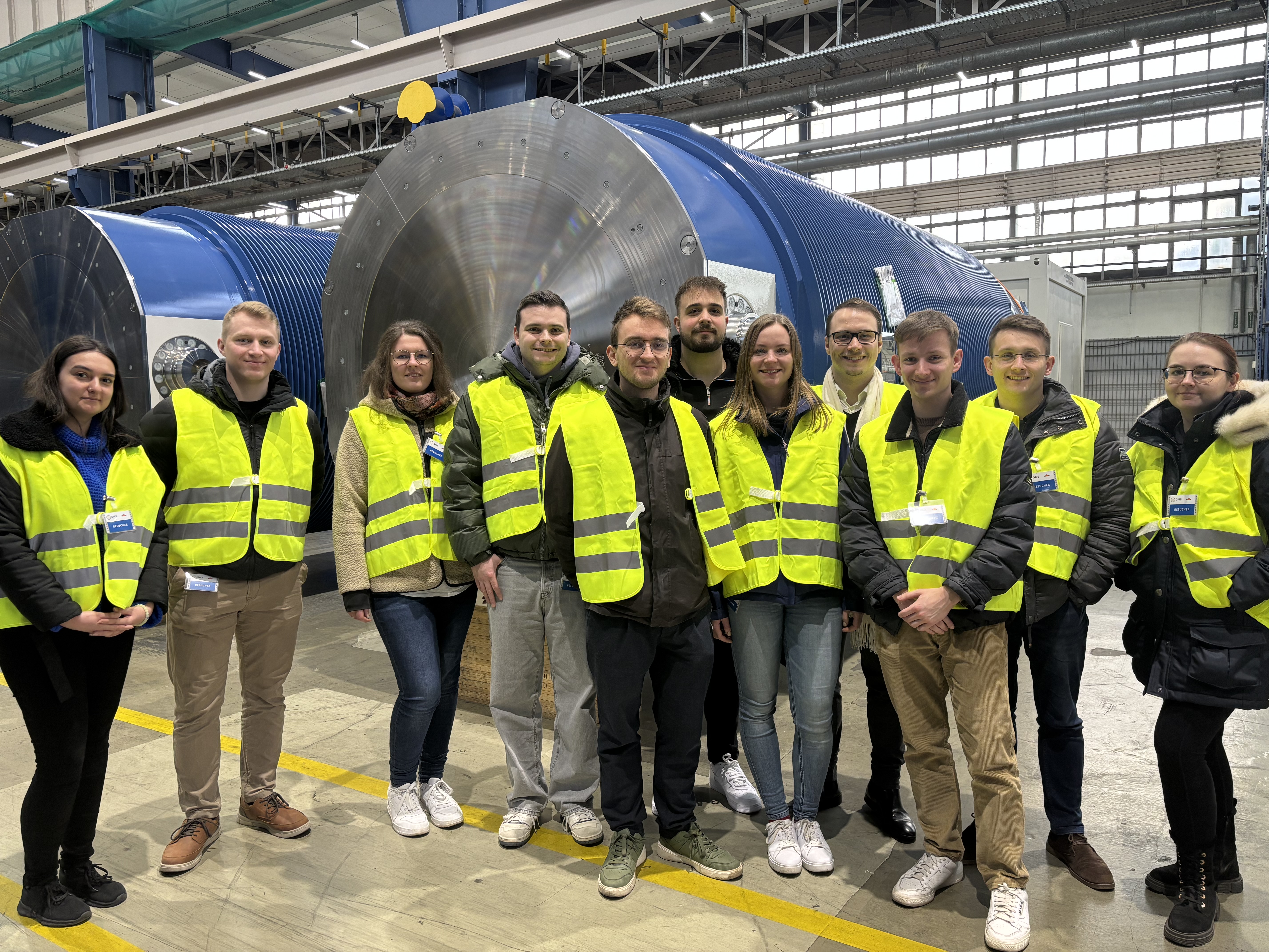 Bei der GNS startete die Exkursion mit einem Vortrag zur Entstehungsgeschichte, Produktion und den besonderen Anforderungen an Transport- und Lagerbehälter. Danach folgte eine Führung durch die Fertigungshallen, in denen sowohl CASTOR©- als auch MOSAIK©-Behälter vom unbearbeiteten Rohling bis zum vollständig montierten Endprodukt besichtigt werden konnten.